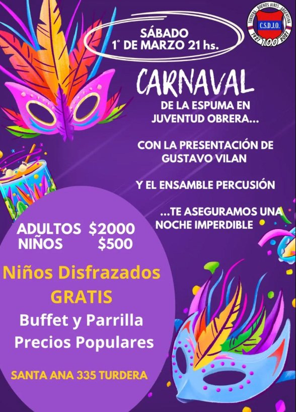 El Club Social y Deportivo Juventud Obrera de Turdera se prepara para una nueva edición de su Carnaval, un evento que ya se convirtió en una tradición para la comunidad. La celebración será el sábado 1° de marzo a partir de las 21 horas en la sede de Santa Ana 335, donde los vecinos de Turdera podrán disfrutar de una noche llena de música, arte y diversión.