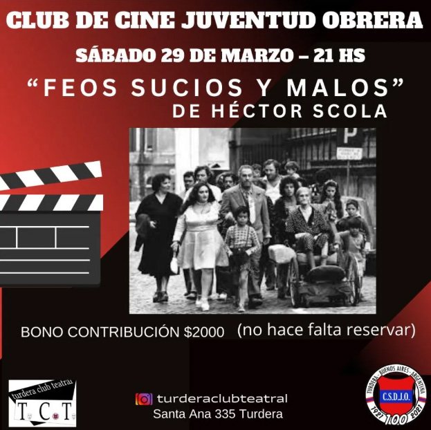 El Club Social y Deportivo Juventud Obrera de Turdera dará inicio este sábado 29 de marzo a su temporada de cine con la proyección de “Feos, sucios y malos”. La función tendrá lugar a las 21 horas en la sede ubicada en Santa Ana 335, y las entradas ya están a la venta, con la posibilidad de adquirirlas hasta el día del evento.