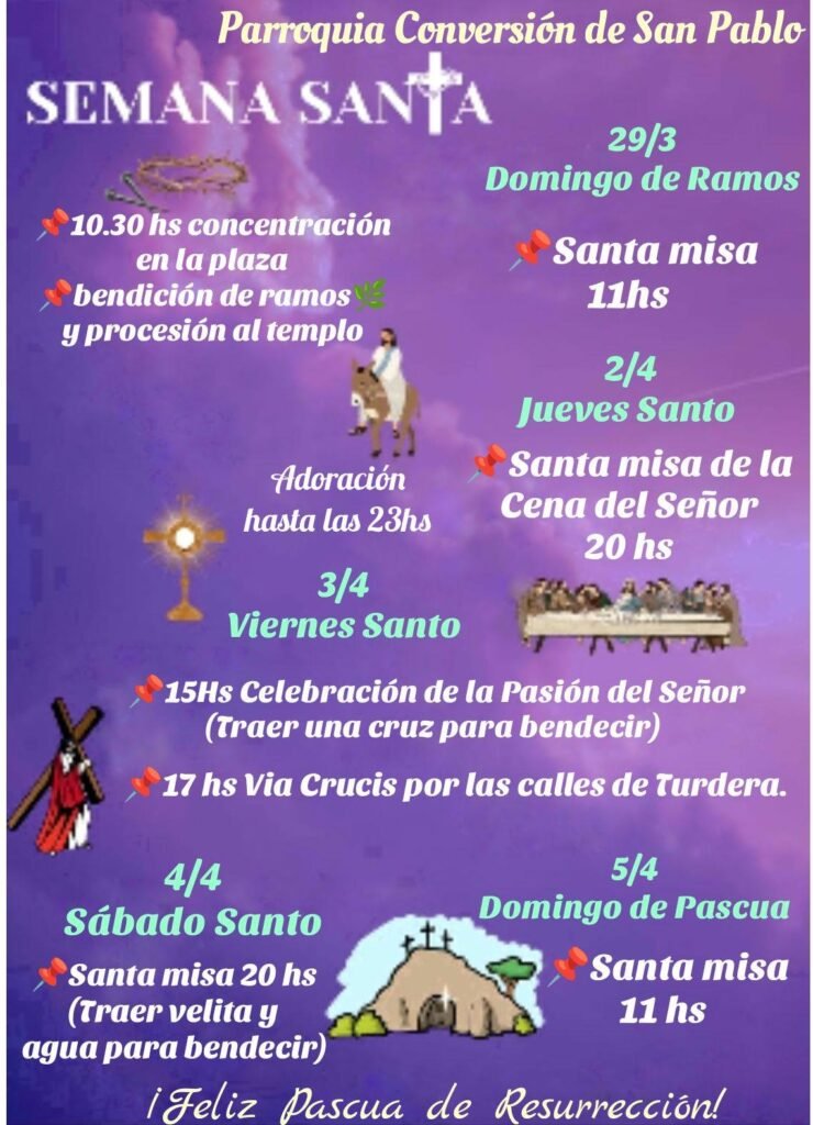 Con el paso del Domingo de Ramos, la comunidad católica de Turdera se prepara para vivir los días centrales de la Semana Santa en la parroquia Conversión de San Pablo, ubicada en Suipacha 101. Fieles y vecinos encontrarán una serie de celebraciones litúrgicas que combinan el recogimiento interior con la participación comunitaria al aire libre.