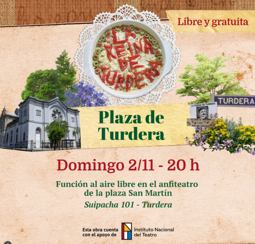 Este domingo 2 de noviembre, a las 20 horas, la obra “La Reina de Turdera” ofrecerá una función especial en el anfiteatro de la plaza San Martín, ubicada en Suipacha 101. La presentación, de entrada libre y gratuita, conmemora cuatro años ininterrumpidos de funciones de este proyecto teatral local, que supo consolidarse en la region .