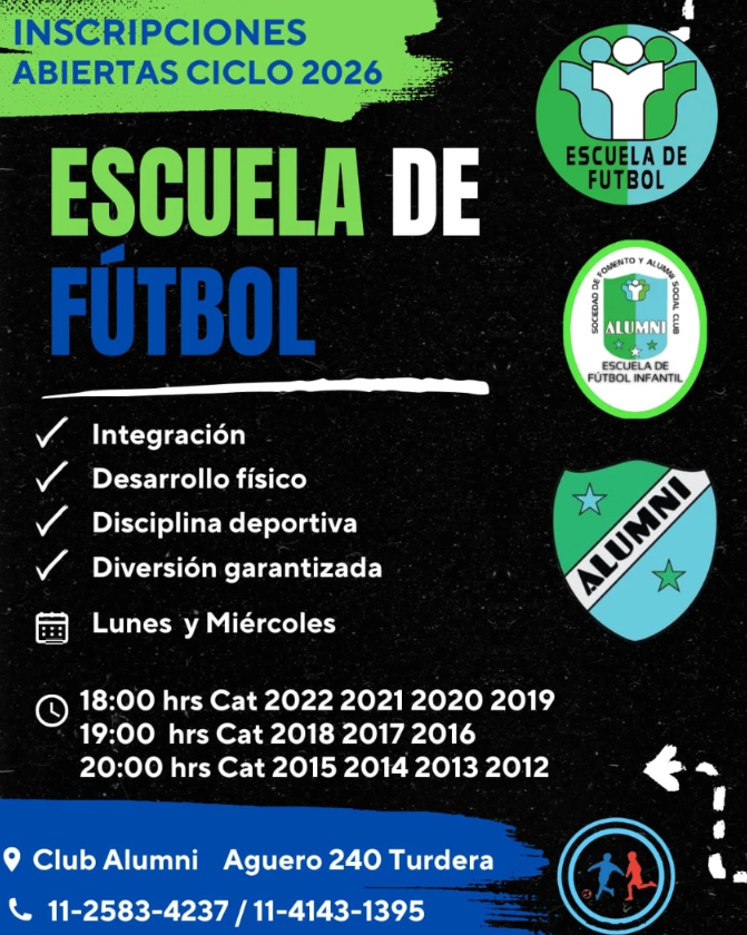 Los interesados en obtener mayor información pueden comunicarse a los teléfonos 1125834237 o 1141431395, o bien enviar un mensaje a través de la cuenta de Instagram @alumni.escueladefutbolinfantil.