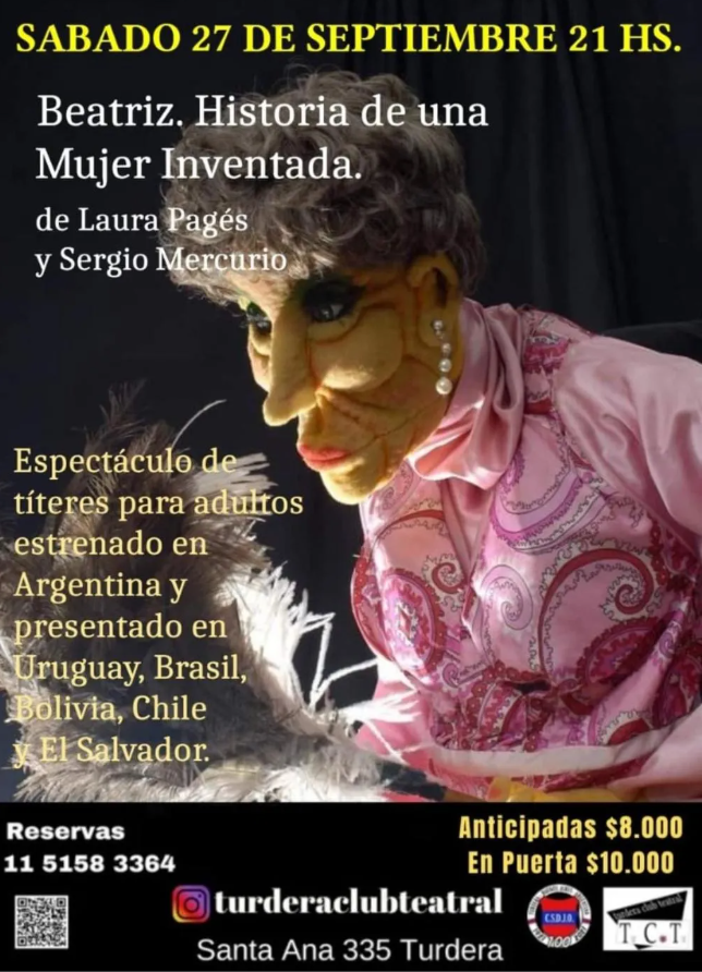 La obra en escena será “Beatriz, la historia de una mujer inventada”, una puesta de títeres concebida para público adulto. La función dará comienzo a las 21 horas y tendrá una duración aproximada de 50 minutos. La dirección está a cargo de Sergio Mercurio, mientras que Laura Pagés se encarga de la actuación y la construcción del personaje principal.
