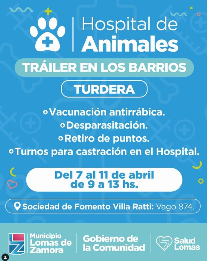 El tráiler del Hospital de Animales continuará brindando atención gratuita en Turdera. En esta semana su sede sera la Sociedad de Fomento Villa Ratti, ubicada en Vago 874, Turdera. Desde el lunes 7 hasta el jueves 11 de abril, de 9 a 13 horas, los vecinos podrán acercarse para vacunar a sus mascotas y solicitar turnos para castraciones. La atención será por orden de llegada.